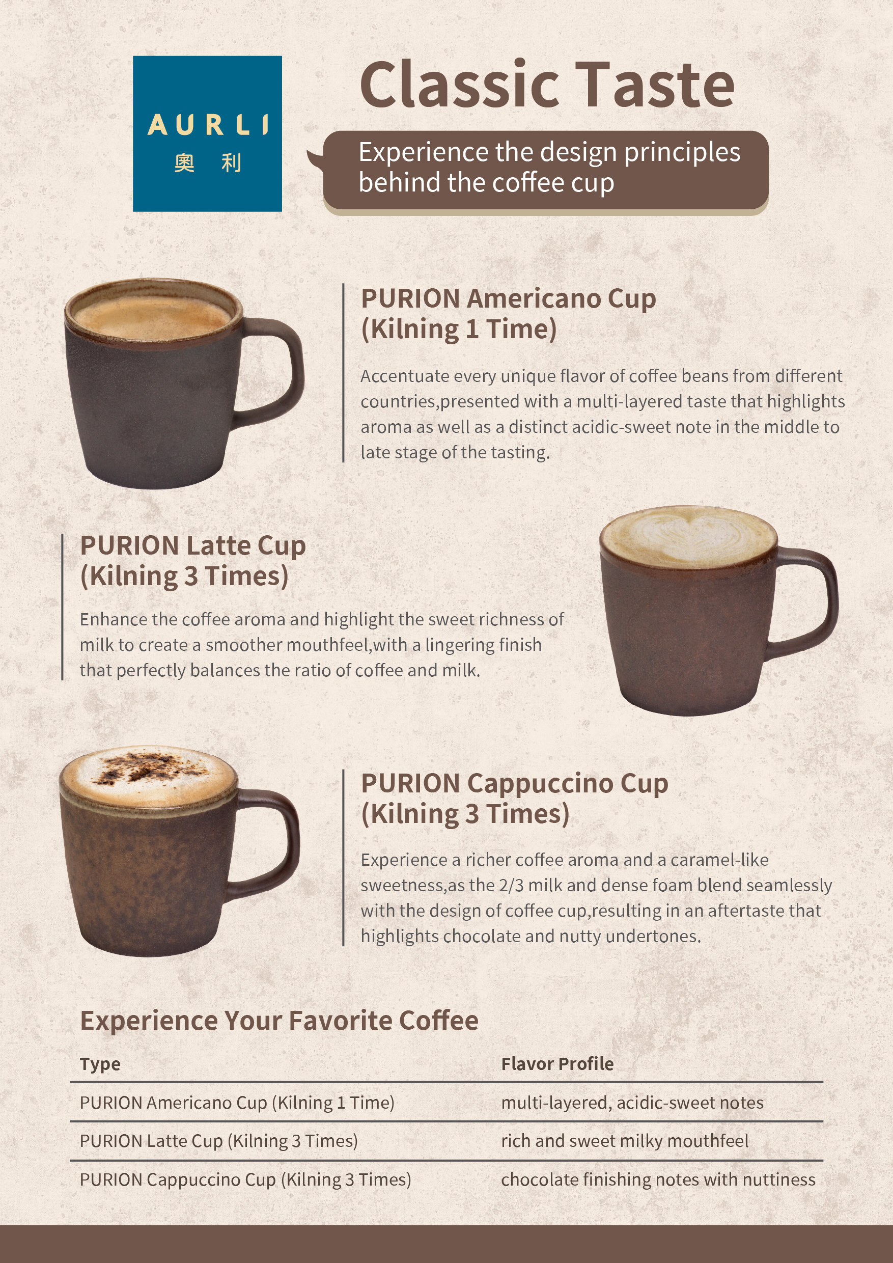 We use a high-temperature oxidation and multiple-stage kilning process to temper and refine our coffee cups, made from a unique blend of natural rocks and clay, which creates our one-of-a-kind PURION coffee cups. PURION is rich in minerals, providing a natural and earthy texture that features similar porphyrite functions to enrich mellow mouthfeel, enhancing the familiar coffee flavor wheel experience.