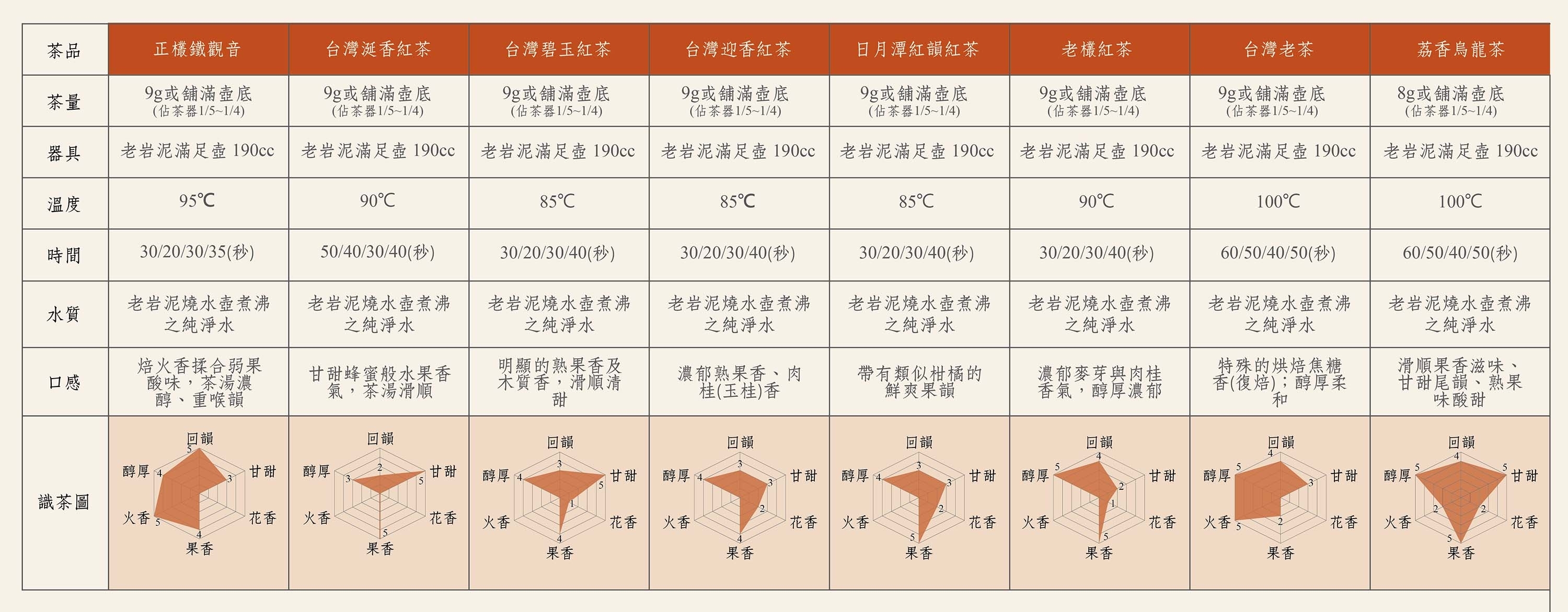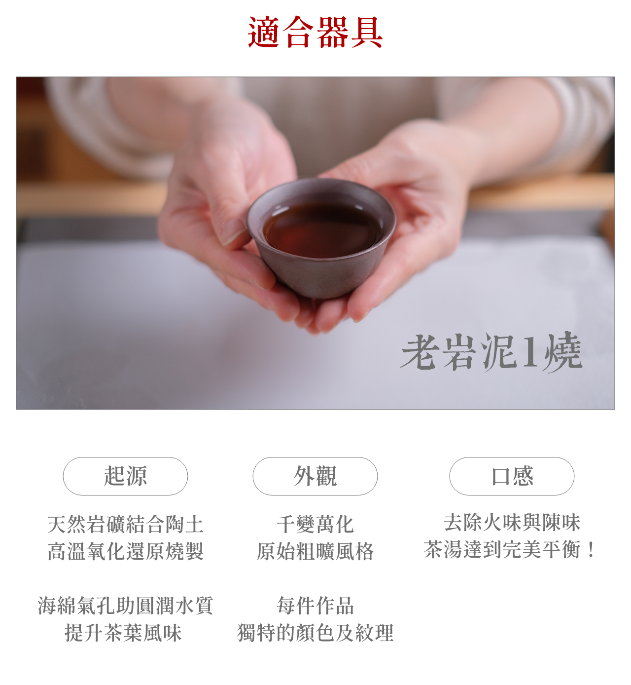 老岩泥系列胎質密度低,導熱較慢,適合重發酵、全發酵茶,如:重烘焙茶、傳統鐵觀音、炭焙烏龍茶、滇紅、紅茶、老茶、普洱茶等。