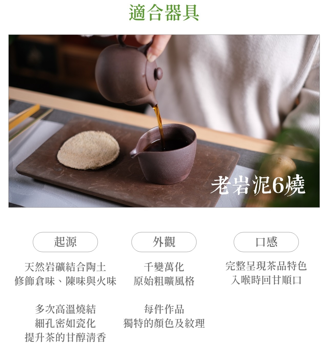老岩泥系列胎質密度低,導熱較慢,再經歷六次的燒製,使整個壺結構更加緊密,更能讓黃色茶湯系茶品發揮其風味。