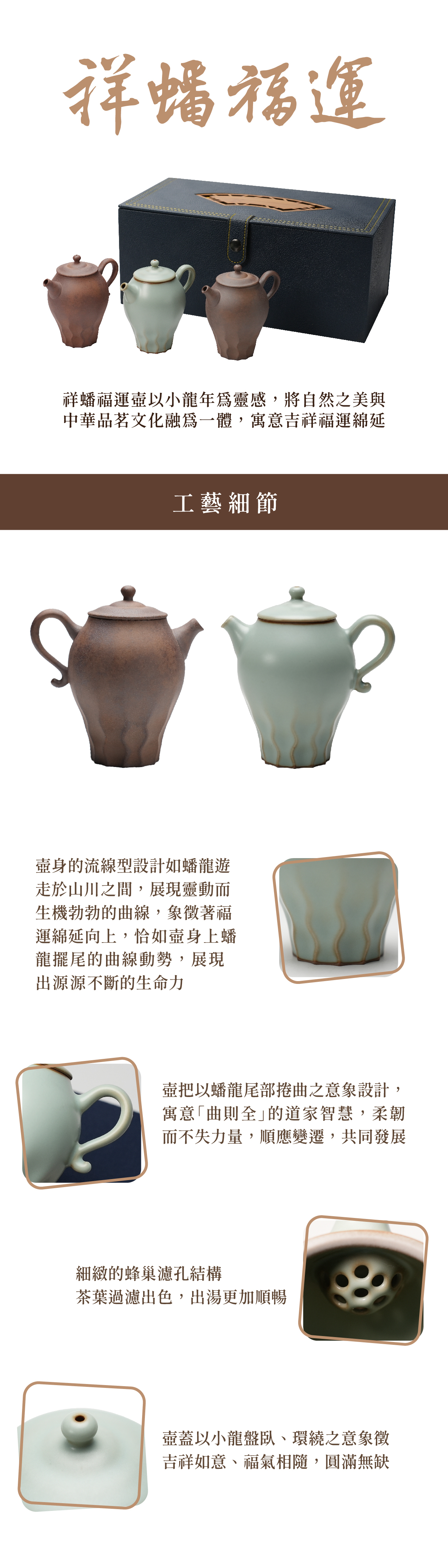 壺身流線型設計猶如蟠龍遊走於山川之間,展現靈動而生機勃勃的曲線;象徵著福運綿延向上,恰如壺身上蟠龍擺尾的取現動式,展現出源源不斷的生命力。