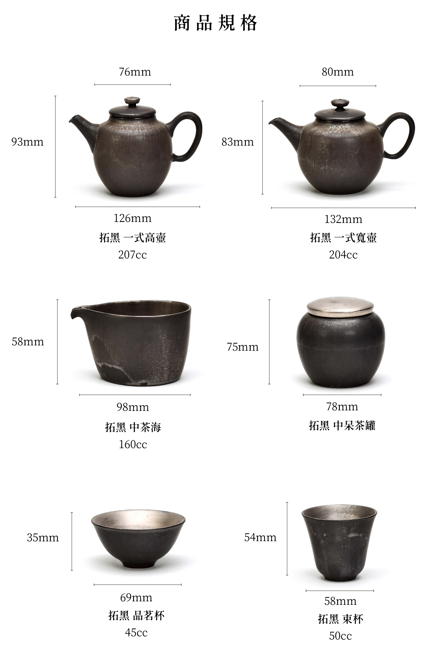 拓黑釉色 (Black glazed)在器物上因坯體形狀呈現不同變化,使黑色器物能夠反射光芒,使黑色從黑暗中顯現出來,變成明亮的顏色。