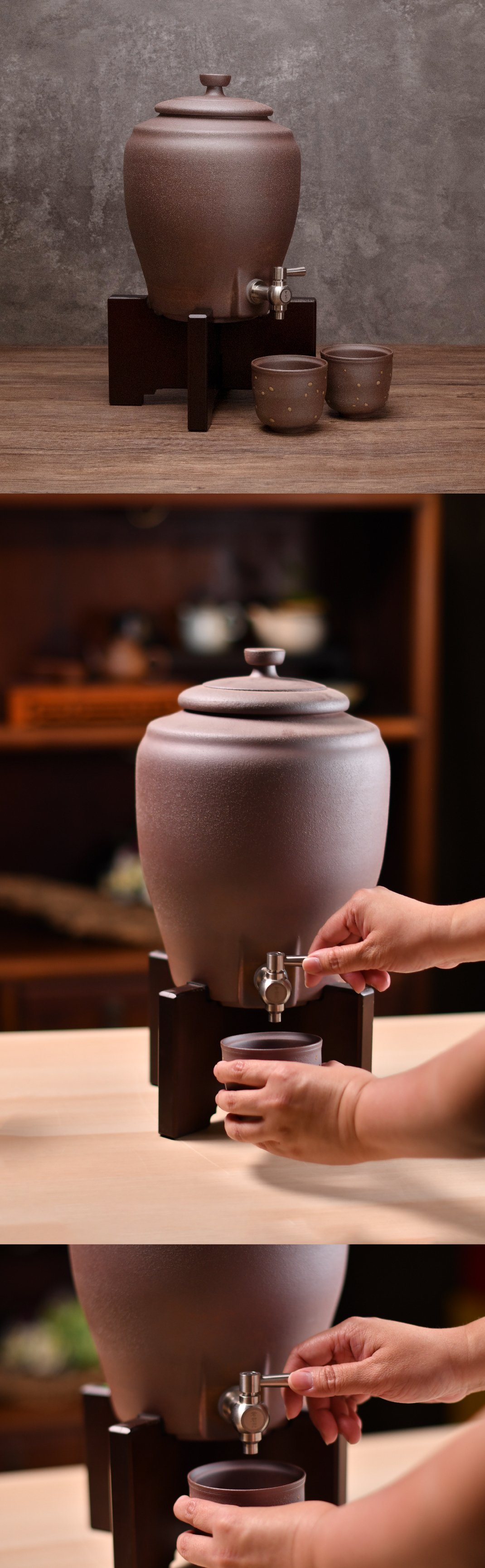 品水罐具有『容量大、操作簡便、功能卓越』三項產品特色,搭配自然松木座、造型流暢簡約。老岩泥系列經多次高溫氧化還原多重燒製,使得胎土呈現自然溫潤的質感,