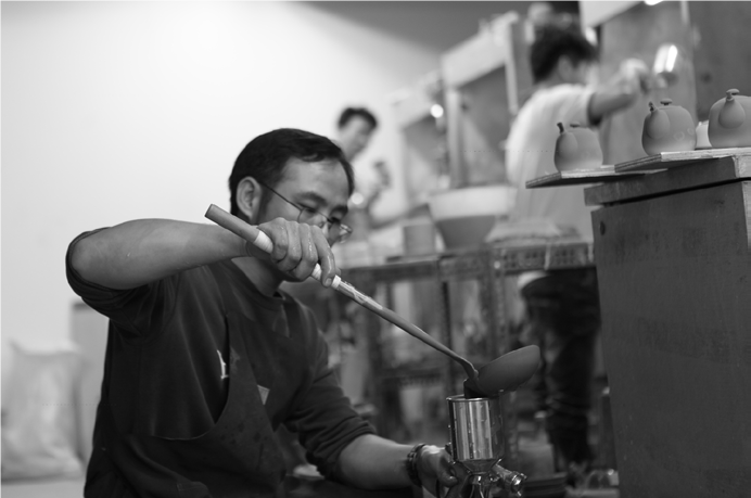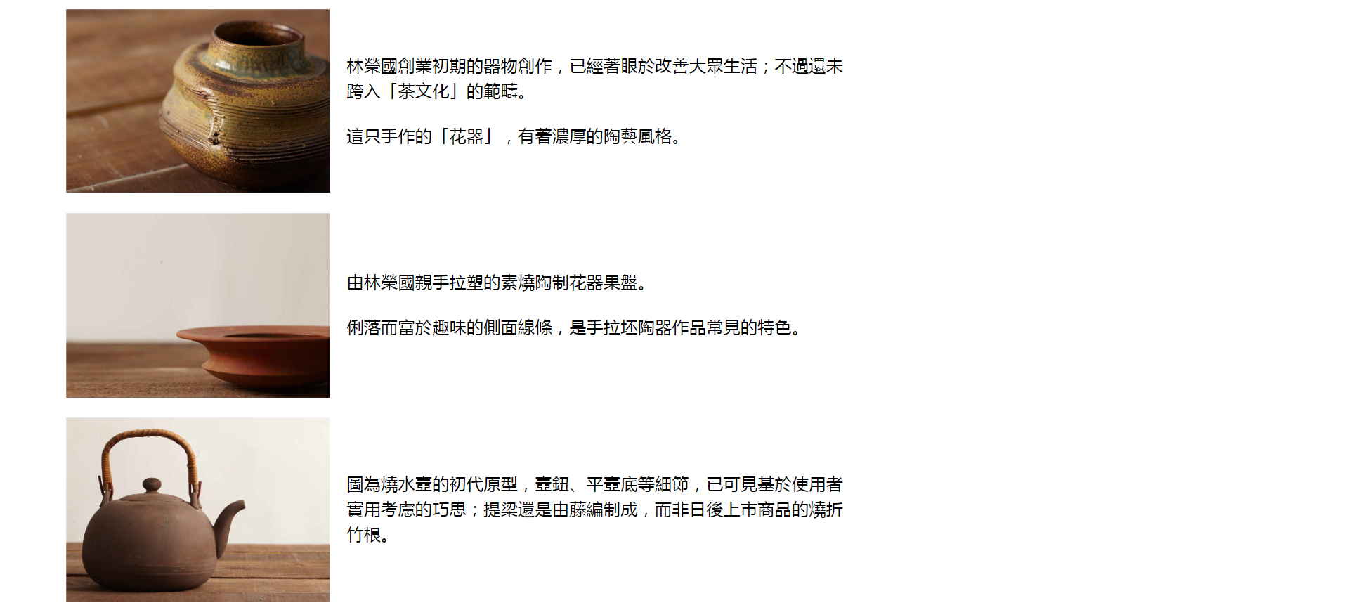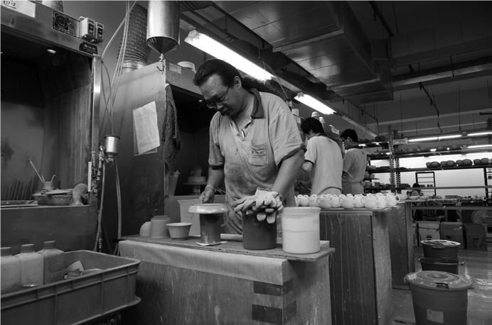 從三個人的陶藝工作室,到百餘人規模的陶作坊,林榮國 沒有一天減少對於製作現場的關注。因為,林榮國知道, 是透過匠師們雙手所創的好作品,才能維繫、支援著「陶作 坊」授信賴、肯定的品牌形象。