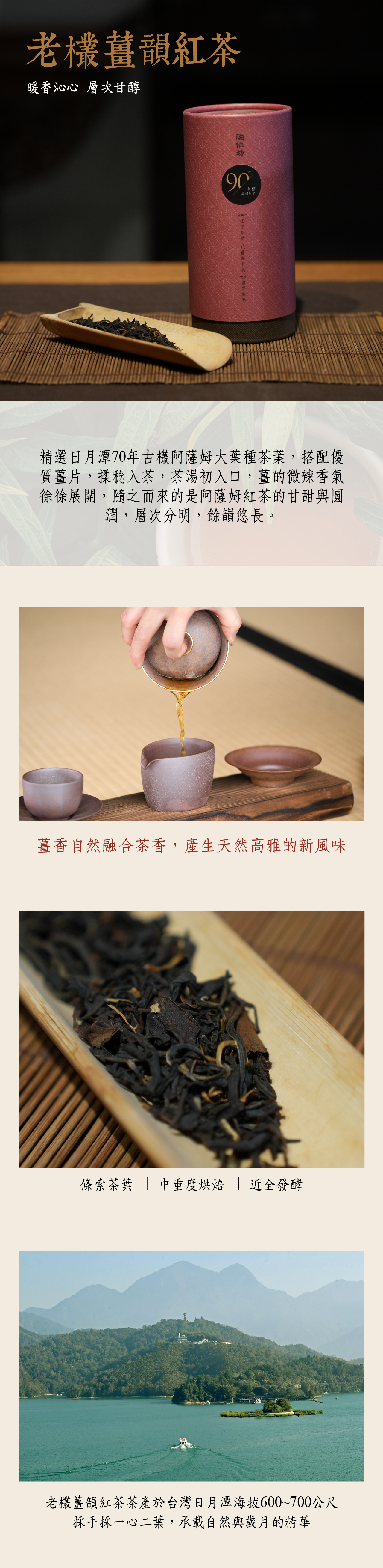 選用日月潭70年古欉阿薩姆大葉種茶葉,承載歲月沉澱與自然精華,並經國家農藥檢測合格,安心無負擔。特別加入優質薑片,揉稔入茶,巧妙融合紅茶的醇厚與薑的溫暖香氣,讓每一口茶湯都飽含暖心滋味。