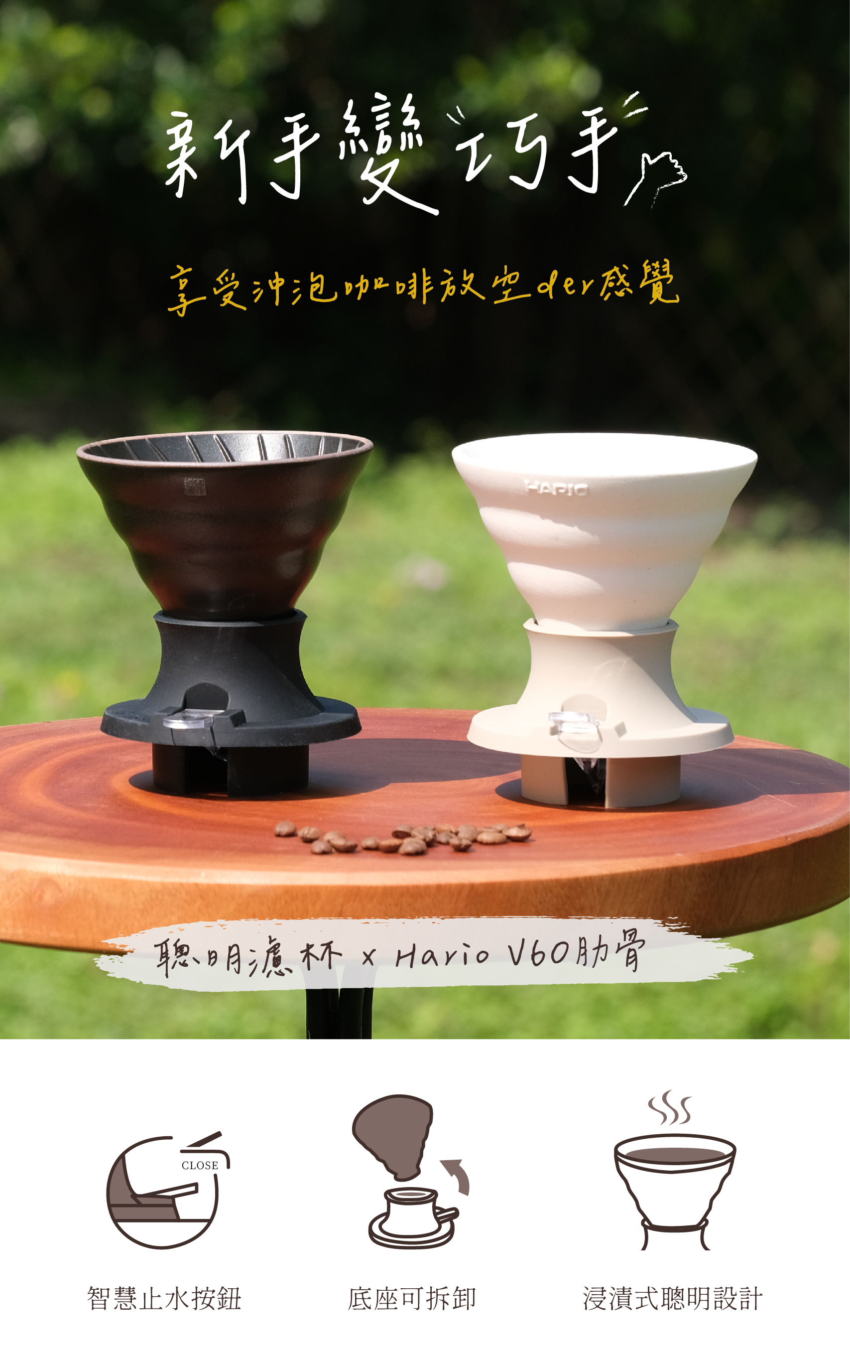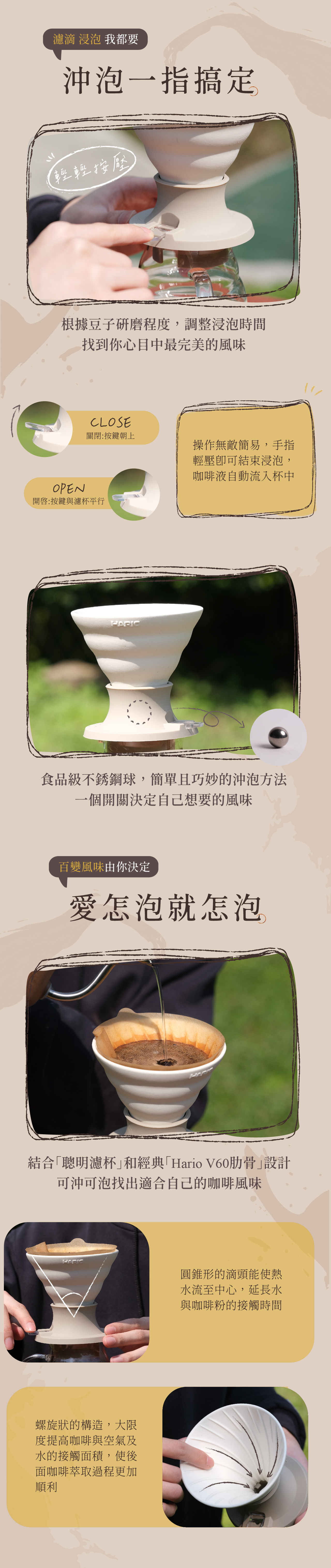 ● 浸漬式聰明設計:結合「聰明濾杯」和經典「Hario V60肋骨」設計,可沖可泡找出適合自己的咖啡風味。