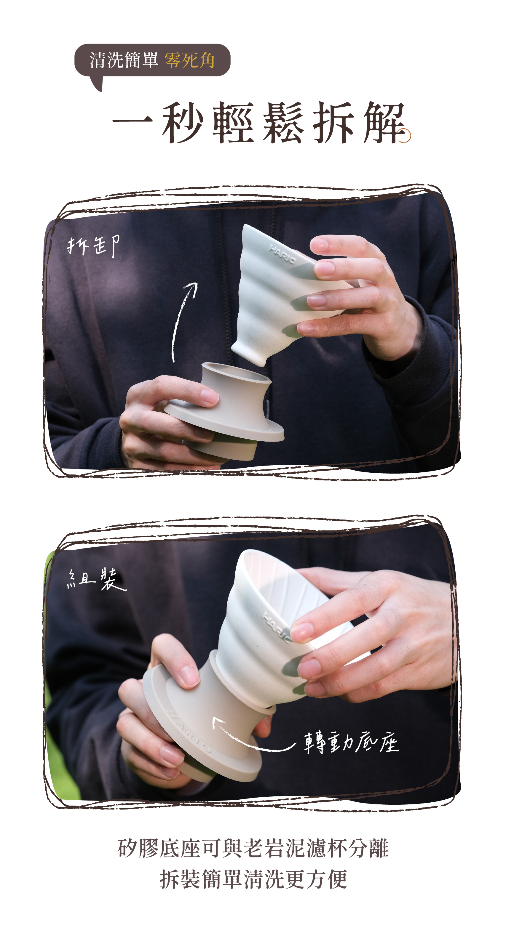 ● 底座可拆卸:矽膠底座可與老岩泥濾杯分離,清洗無死角。