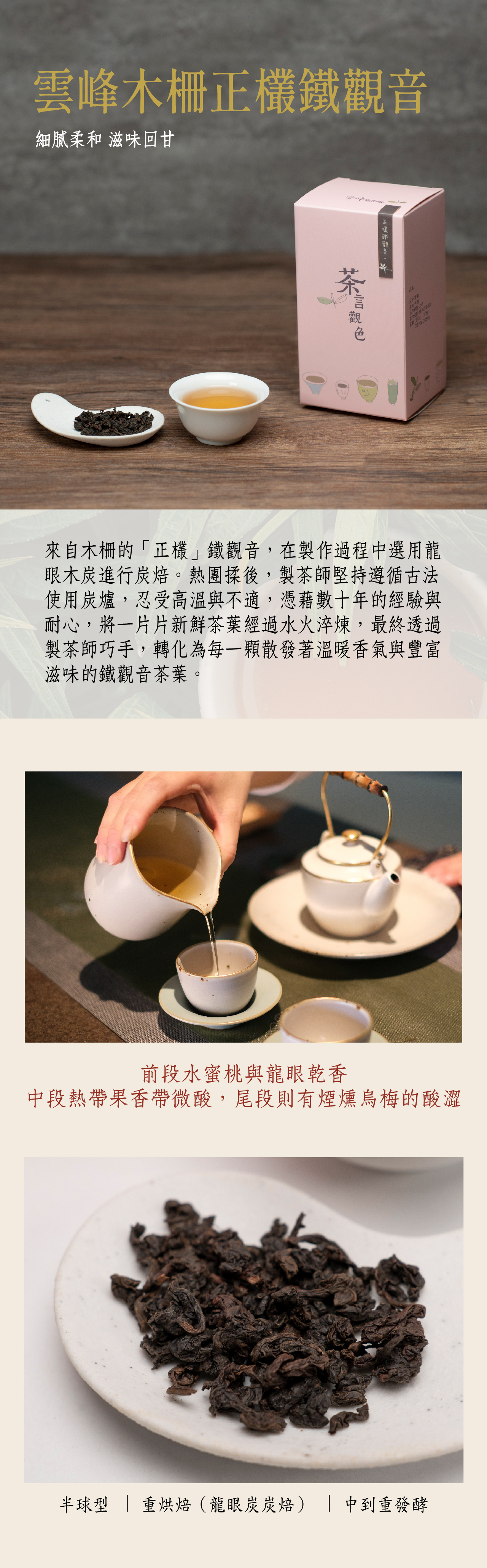 生產於台北市木柵地區,嚴格依照古法製作。整個過程從日光萎凋開始,接著進行室內靜置,再經過浪菁發酵,直到茶菁的青草味完全消退,果香四溢,隨後進行熱團揉製。