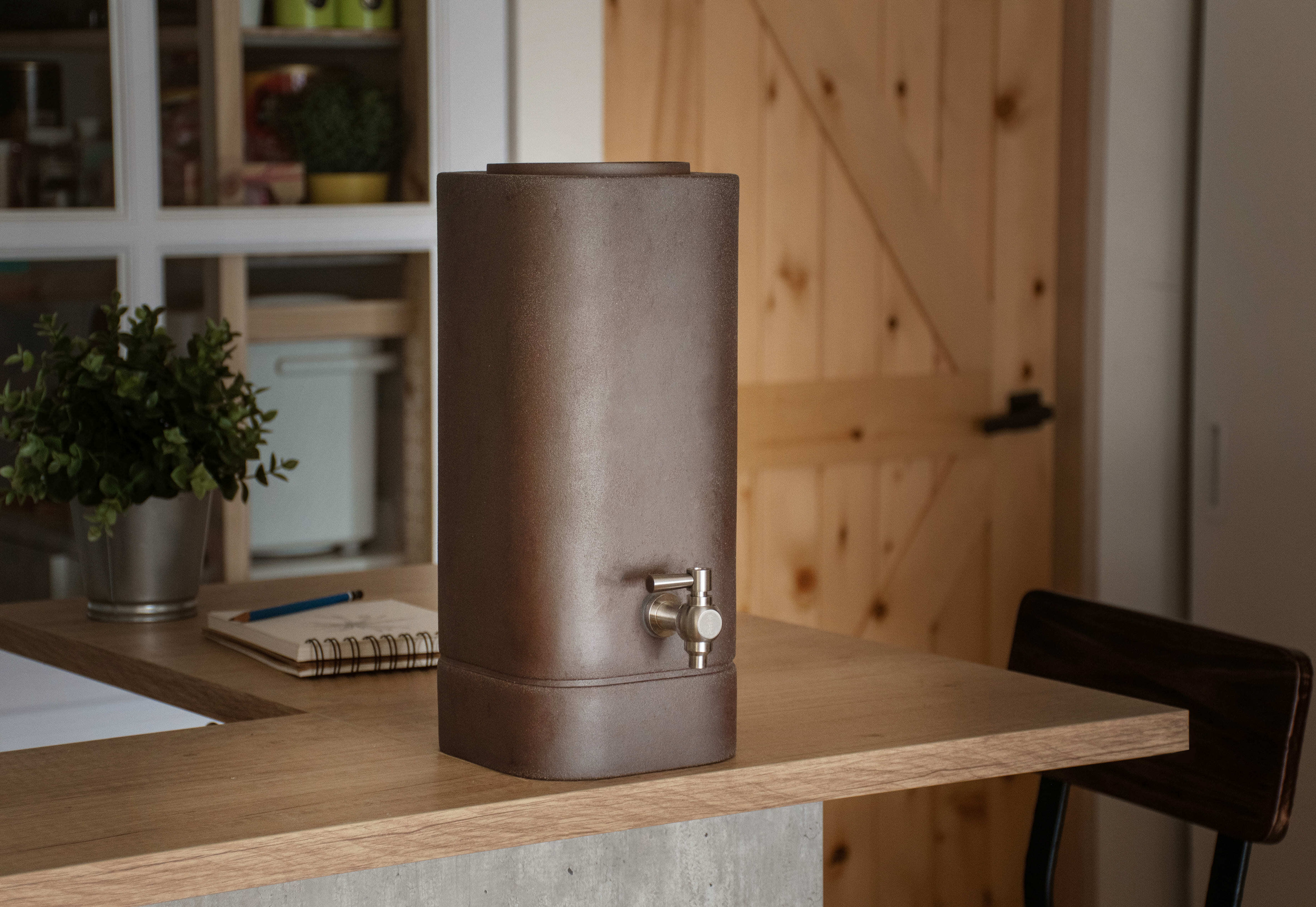 水立方儲水罐以粗獷老岩泥,型塑直立長方、色調沉穩的時尚外型,滿足現代人對於飲水及品味空間的追求。